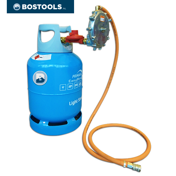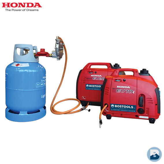 De Honda generator wordt geleverd inclusief lagedrukregelaar (ronde zilveren regelaar), gasslang met snelkoppelingen en inspuitstuk welke op de carburateur zit voor gemonteerd. (Gasfles niet meegeleverd.)